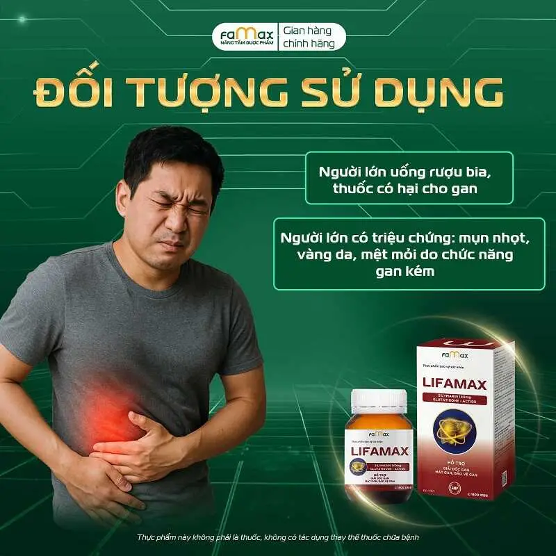 Giải độc gan Lifamax có công dụng hỗ trợ giải độc gan, mát gan và bảo vệ gan; hỗ trợ giảm các triệu chứng mụn nhọt, vàng da, mệt mỏi do chức năng gan kém, qua đó góp phần hỗ trợ cải thiện tình trạng gan khi men gan tăng cao do chế độ ăn uống và sinh hoạt chưa phù hợp.